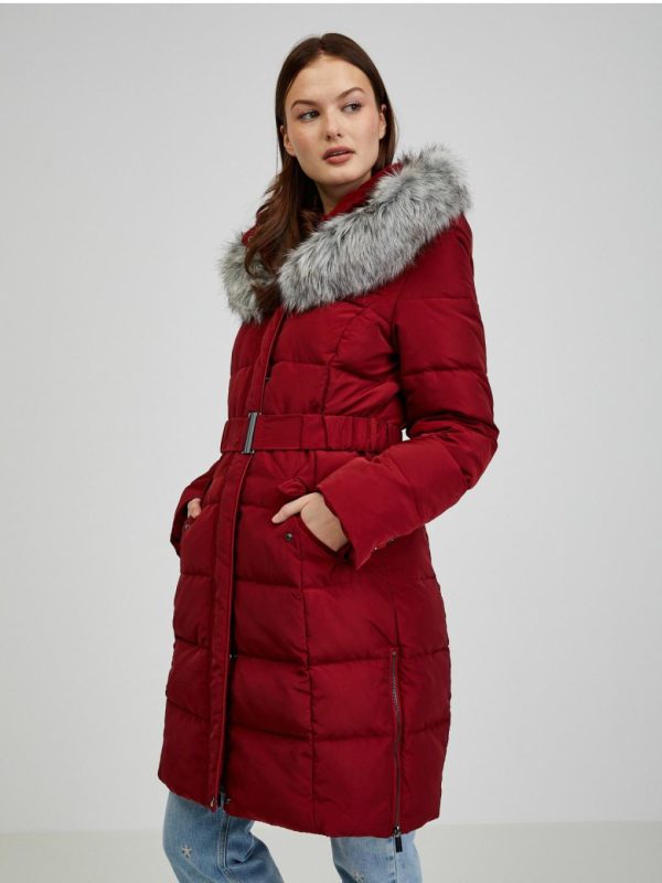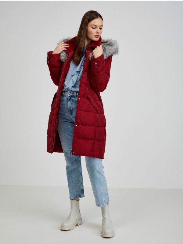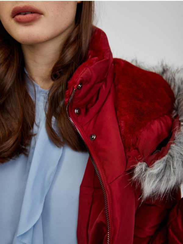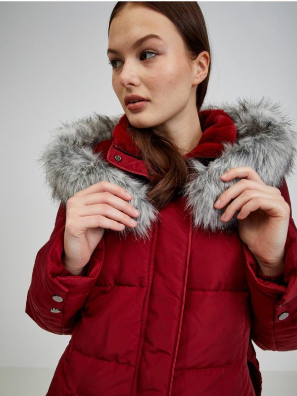Orsay Damen Wintermantel in Weinfarbe mit Kapuze und Kunstpelz